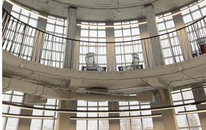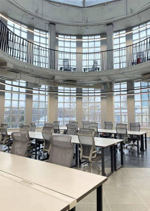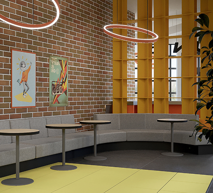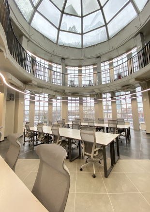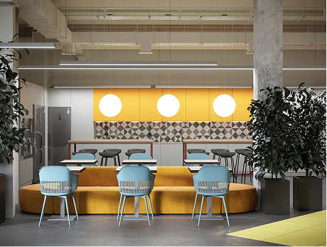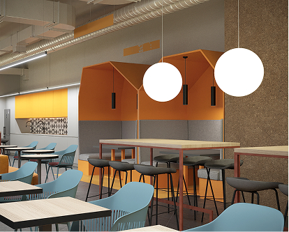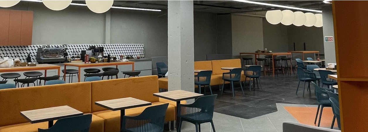 в просторном уютном хабе можно перекусить, выпить рожковый кофе, пообщаться с коллегами или отдохнуть от рутины на диванчике